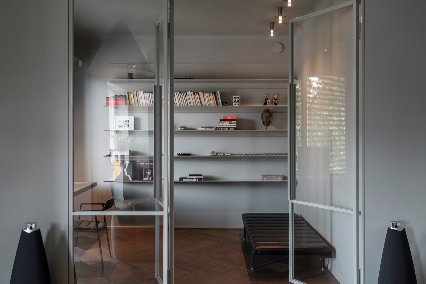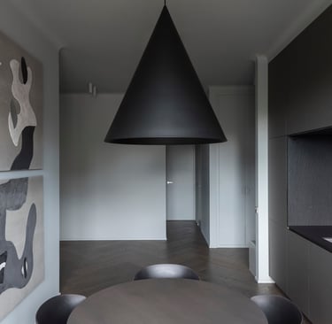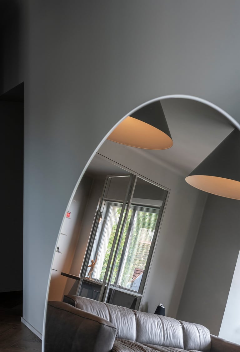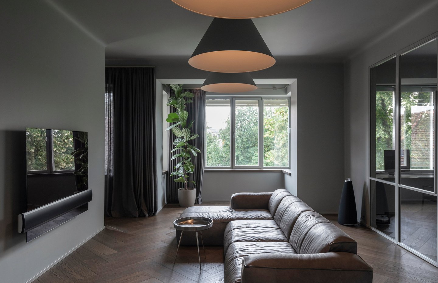 135 kvadratų butas randasi Kauno miesto centre prie pat šlaito, Vytauto parko papėdėje, Kauno tarpukario modernizmą menančiame name. Butas funkciškai orientuotas dviem kryptimis - miesto/gatvės bei miško parko/kalno, todėl šis dvipusiškumas aiškiai padiktavo ir funkcinį gyvenamųjų erdvių išplanavimą. Svetainė, virtuvė ir valgomasis – visada skubančio ir triukšmingesnio miesto pusėje, o miegamieji savo langus atgręžę į ramybe alsuojančią parko žalumą.