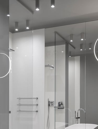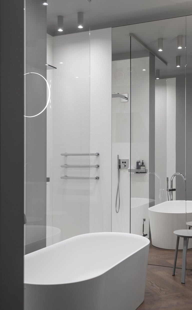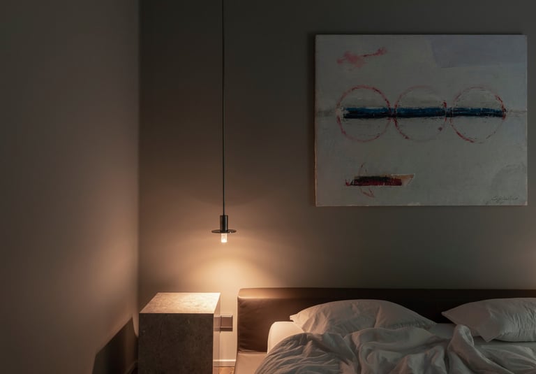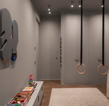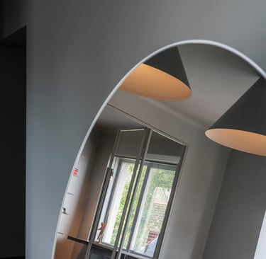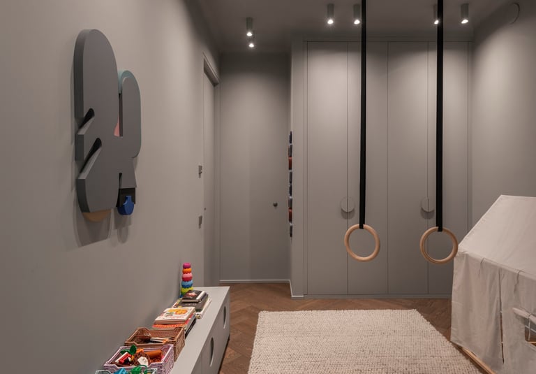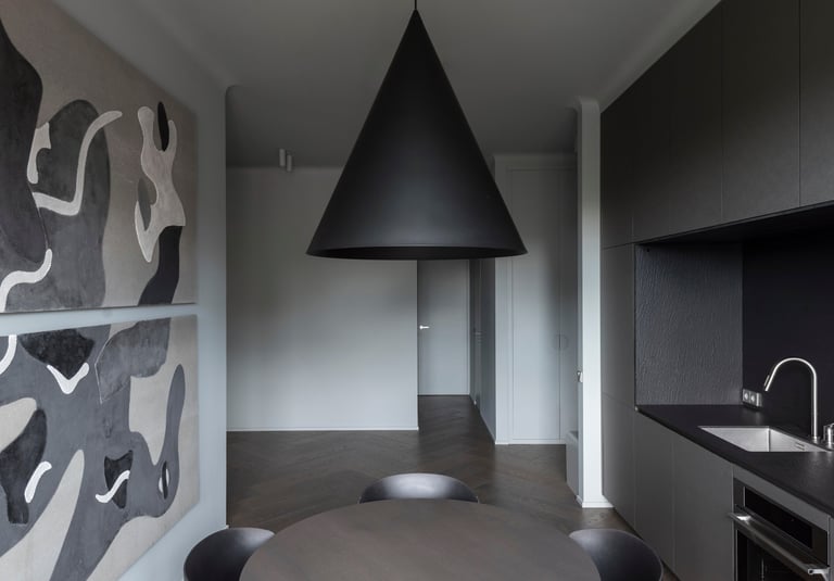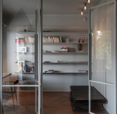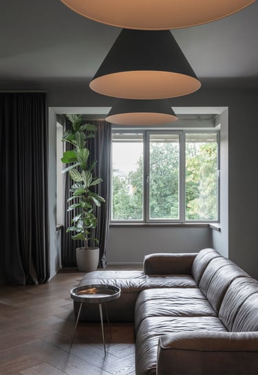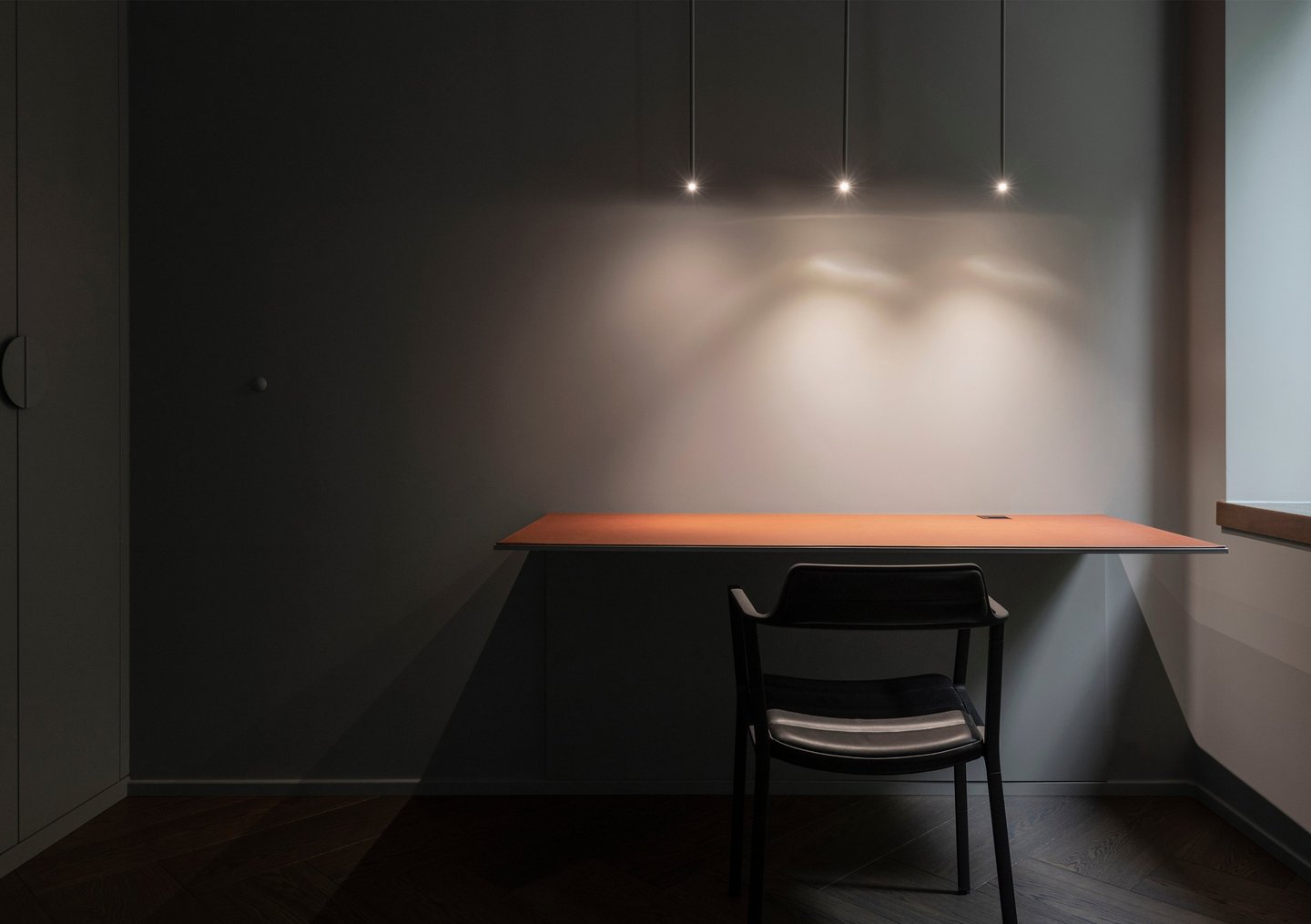 135 kvadratų butas randasi Kauno miesto centre prie pat šlaito, Vytauto parko papėdėje, Kauno tarpukario modernizmą menančiame name. Butas funkciškai orientuotas dviem kryptimis - miesto/gatvės bei miško parko/kalno, todėl šis dvipusiškumas aiškiai padiktavo ir funkcinį gyvenamųjų erdvių išplanavimą. Svetainė, virtuvė ir valgomasis – visada skubančio ir triukšmingesnio miesto pusėje, o miegamieji savo langus atgręžę į ramybe alsuojančią parko žalumą.